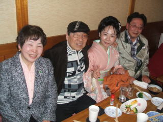| 今回は、関東後援会の有志の方々が応援に来て下さいました! 打ち上げ二次会にて。…左端、高橋つる子さん。 …左端、江見茂さん。…真ん中、大河正泰さん。 次に小林節男さん。…万祐、右端、大河正泰さん。 |